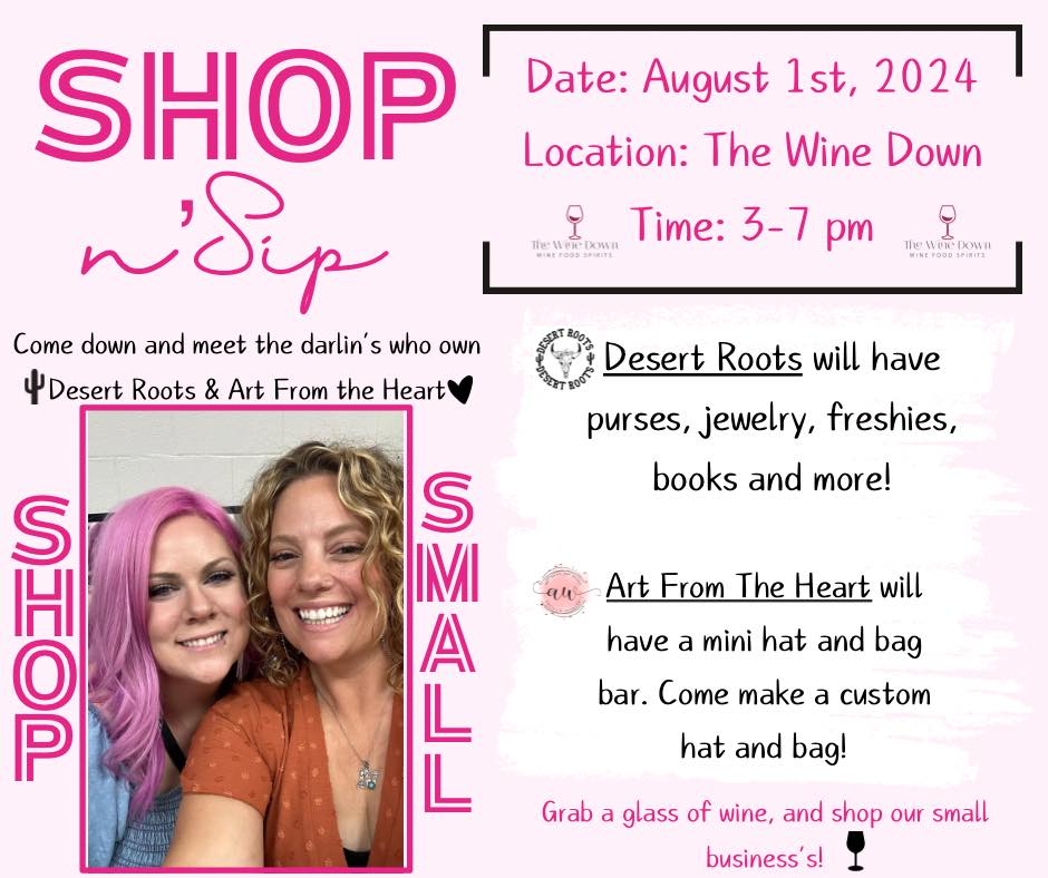 Join Desert Roots and Art from the Heart by Ashley for a Shop ‘n Sip event at The Wine Down, 250 Hwy 160 Ste. 8 (right next door to Albertsons). Desert Roots will have purses, jewelry, freshies, books and more! Art from the Heart by Ashley will have a mini hat and bag bar. Come make a custom hat and bag. Grab a glass of wine, cocktail or mocktail and shop!