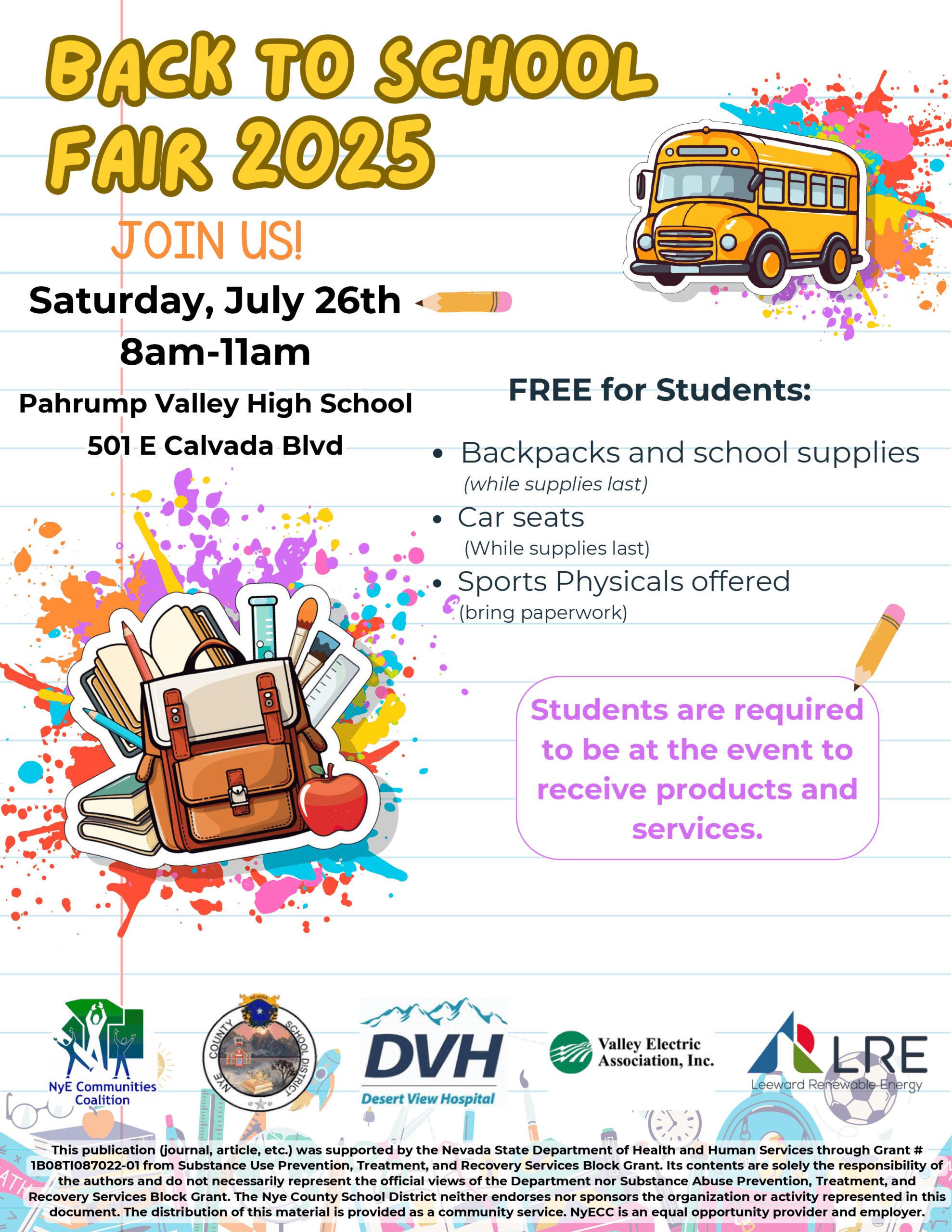 PVHS 501 E Calvada Blvd, PahrumpFree for Students - while supplies last: Backpacks and school supplies Car seats