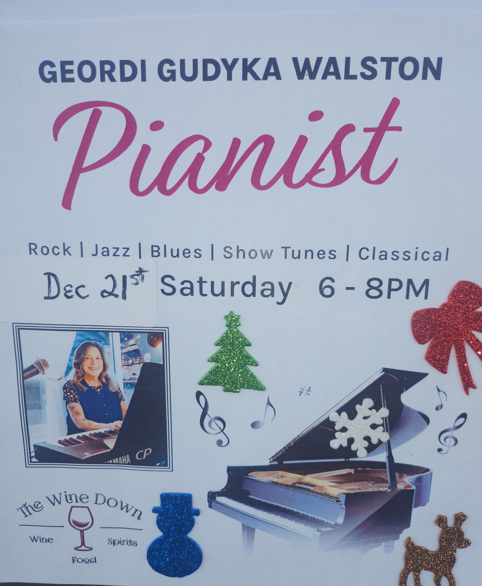 The Wine DownPianist, Geordi Gudyka Walston, on Saturday, Dec. 21 from 6-8p.m.