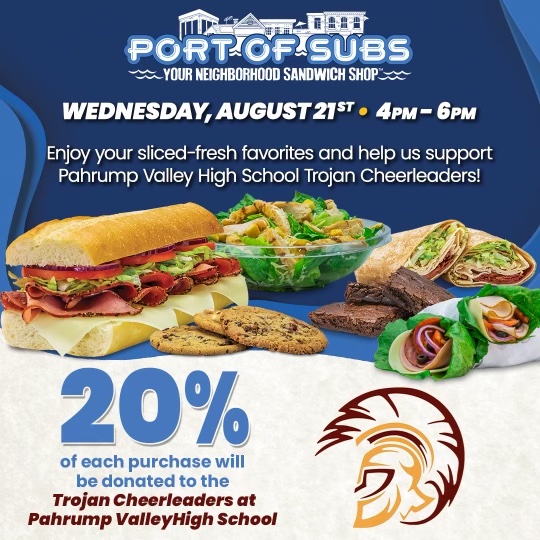 Visit Port of Subs on August 21st from 4-6 p.m. 20% of proceeds will go to the PVHS Trojans Cheerleading Team. These funds will be used for new mats and jerseys.