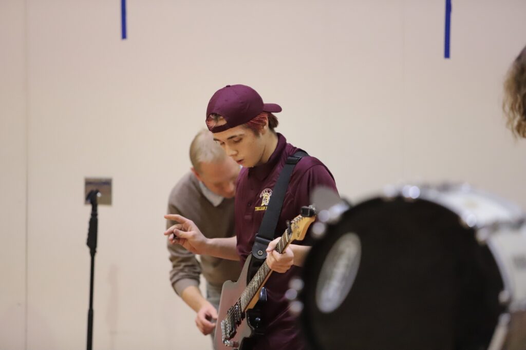 The Pahrump Valley High School boys’ basketball game on Monday night, December 9, had more than just athletic excitement — the PVHS Garage band took the stage, bringing live music to halftime. Known as “Garage the Band” outside of school, the group delivered an electric performance of Panic! At The Disco’s “I Write Sins Not Tragedies,” captivating the audience and adding to the game-night energy.