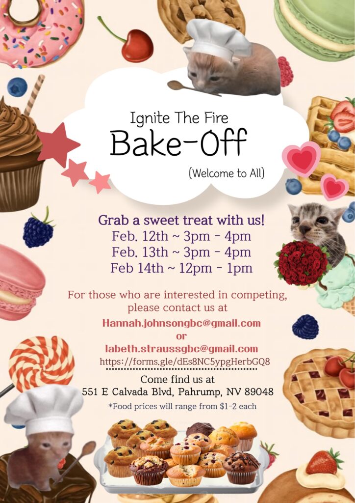 The event, themed “Ignite the Fire,” is open to all and will be held at GBC’s Pahrump campus, 551 E Calvada Blvd. Participants can either compete in the bake-off or take part in the voting process by purchasing baked goods. Each purchase comes with a voting form, allowing attendees to have a say in crowning the best baker.
