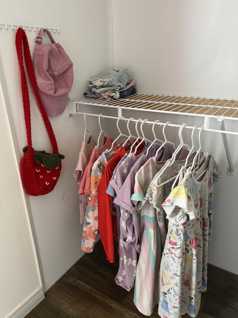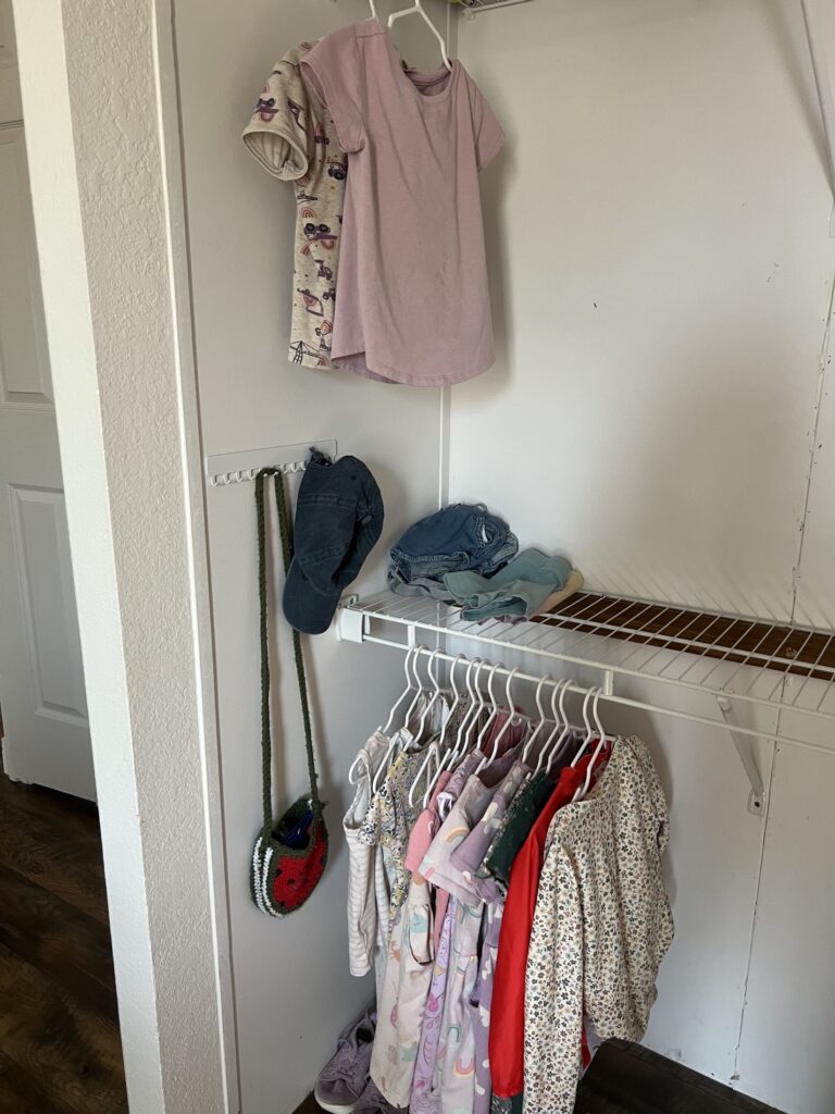 These small wardrobes only work if you’re doing laundry frequently, which means it won’t have time to build into an overwhelming multiple load monster. If you’re only planning on doing laundry once a week, adjust the amounts of clothes each kiddo keeps. The goal is to have enough that you can skip a couple days of laundry if something comes up, but not so much you can ignore it ’til the pile covers your entire bed.
