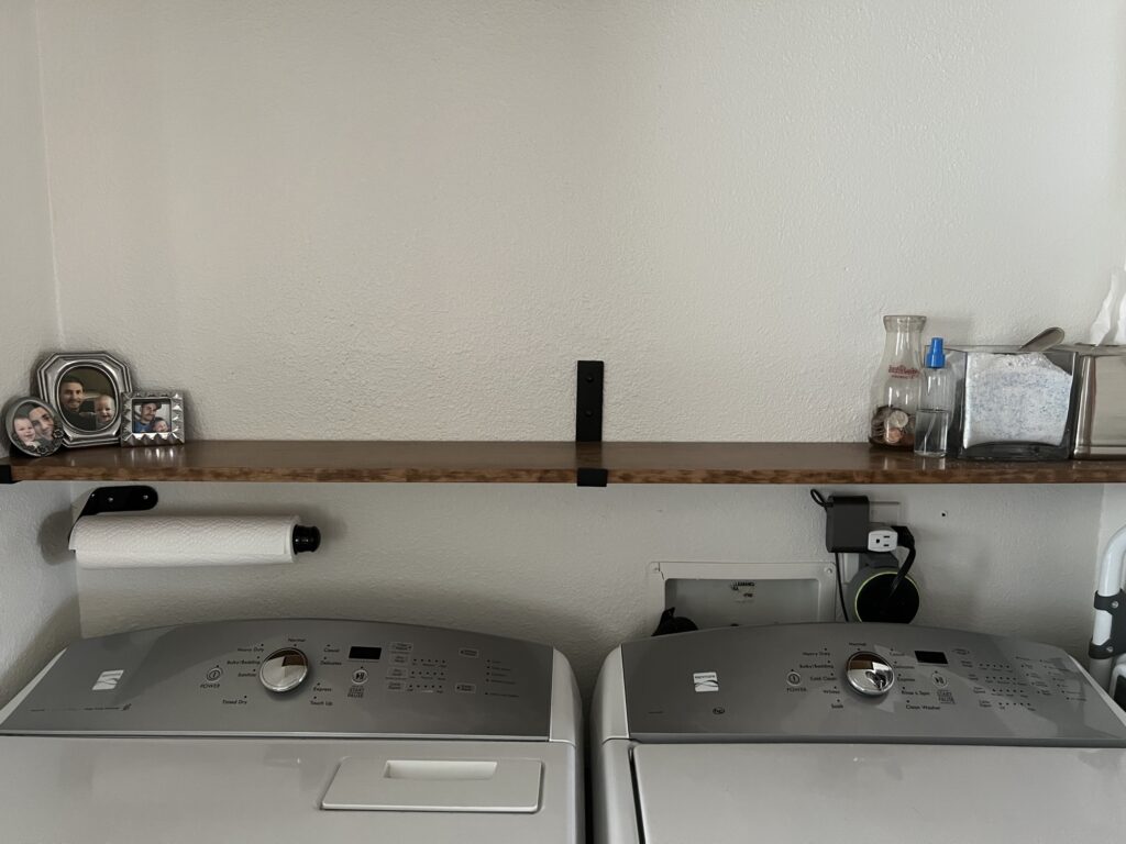 This set-up doesn’t really make laundry enjoyable, but it does make it much less stressful than previous methods I’ve tried. To make this daily task better, I try to make my laundry area pretty. I’ve added pictures of my favorite people in the world in thrifted frames. I sort and fold right on top of the machines, so the photos remind me of the people I love serving – even if it’s in a never ending chore of stain treatment. I also put the detergent in a thrifted open glass container with a scoop, which eliminates the frustration of fiddling with a cardboard box. The stain remover I use is in the tiny spray bottle, and the change jar is for loose change found in pockets a.k.a Mama’s laundry tips. These small changes have made a surprisingly big impact.