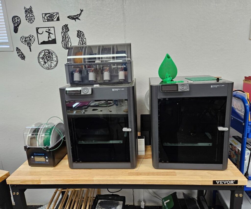 Alongside the laser cutter, NYESPACE houses two Bambu Lab P1S 3D printers, which allow for multi-colored prints and the use of various filament types, including water-resistant ABS for functional projects like aquarium decorations.