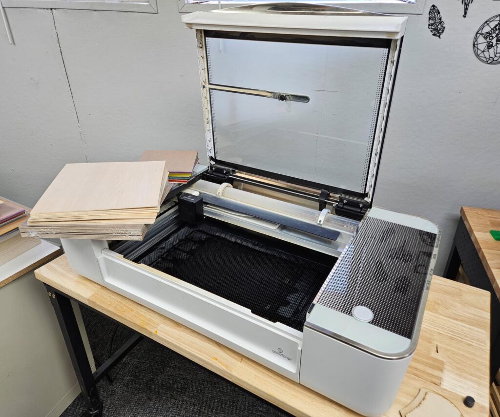 “We use it for everything from layered wood art to custom signs and earrings,” Nick explains. “It’s a CO2 laser, so it can even engrave on glass and metal.”