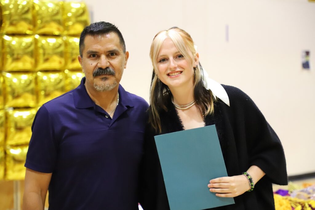Mrs. Veloz then passed the microphone to Assistant Principal Mr. Jason Odegard, who introduced the presentation of athletic scholarships. Bryan Wulfenstein joined him on behalf of Double M Construction and the Wulfenstein Family Scholarship, to honor student-athletes who excelled both on the field and in the classroom. The Scholar Athlete Awards, funded by Double M Construction, were presented to Sasha Strain and Antonio Veloz. The Outstanding Senior Athlete Awards, supported by the Wulfenstein Family Scholarship, went to Sasha Strain and Matthew Lopez.