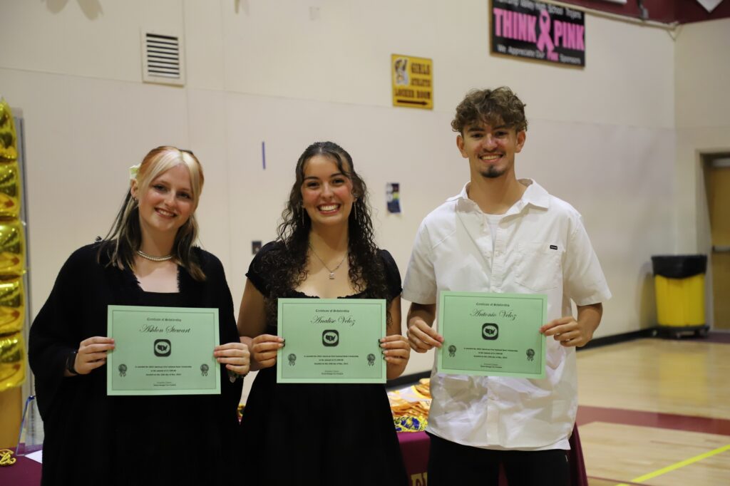 Honors graduate sashes recognized an extensive list of students, including Alejandra Abarca-Franco, Silas Allen, Adriana Amador, Jesse Araujo, Chayla Baang, Charlotte Ballantine, Nash Barnes, Wolfe Beckley, Asia Bell, Madelynn Boruchowitz, Luis Calderon Gomez, Kayleen Carranza, Sergio Carrillo, Joshua Christiansen, Danika Cox-Hosino, Ryleigh Denton, Jasmine DiPreta, Angelle’Keesha Dusich, Liberty Hippach, Abigail Hull, Anthony Hunt, Matthew Lopez, Gracy Macaulay, Emilie Martin, Nivea Moss, Randall Murray, Isaac Norton, Carter Nygaard, Saida Pearson, Valery Romero, Logan Shelton, Shaianne Sparkman, Alexis Staples, Ashlon Stewart, Sasha Strain, Annie Turmelle, Angelina Valdez, Antonio Veloz, Analise Veloz, Lyndsey White, Carlyn Williams, Madison Mendenhall, Matthew Young, Aliana Zuniga, and Andrew Zurn.