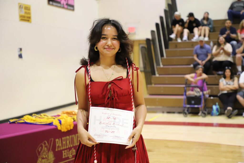 The gymnasium at Pahrump Valley High School was filled with pride and applause on the evening of Wednesday, May 28, as families, educators, and students gathered for the Senior Awards Night to celebrate the accomplishments of the Class of 2025. The evening kicked off with the pledge of Allegiance by senior Abigail Alberto Amador, followed by opening remarks from Principal Mrs. Desiree Veloz. Her message set a tone of recognition and encouragement, reflecting on the achievements of the graduating class.