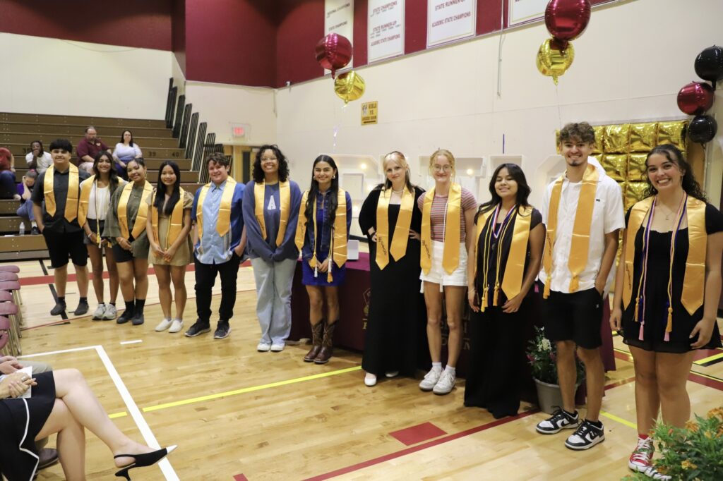 Mr. Curtis presented Yearbook cords to editors Charlotte Ballantine and Bryn Mazlo, with Head Editor cords going to Analise Veloz and Madelynn Boruchowitz. National Honor Society cords were given to Alejandra Abarca-Franco, Abigail Alberto Amador, Wolfe Beckley, Madelynn Boruchowitz, Jemima Chavez, Kaydence (Luka) Farrell-Anderson, Abigail Hull, Christopher George Jacks, Jordan Onigkeit, Alexis Staples, Antonio Veloz, Amanda Wesatzke, Madison Mendenhall, and Carlyn Williams. Officer cords were presented to Gianni Ayala, Angelina Valdez, Analise Veloz, and Michael Keyes.
