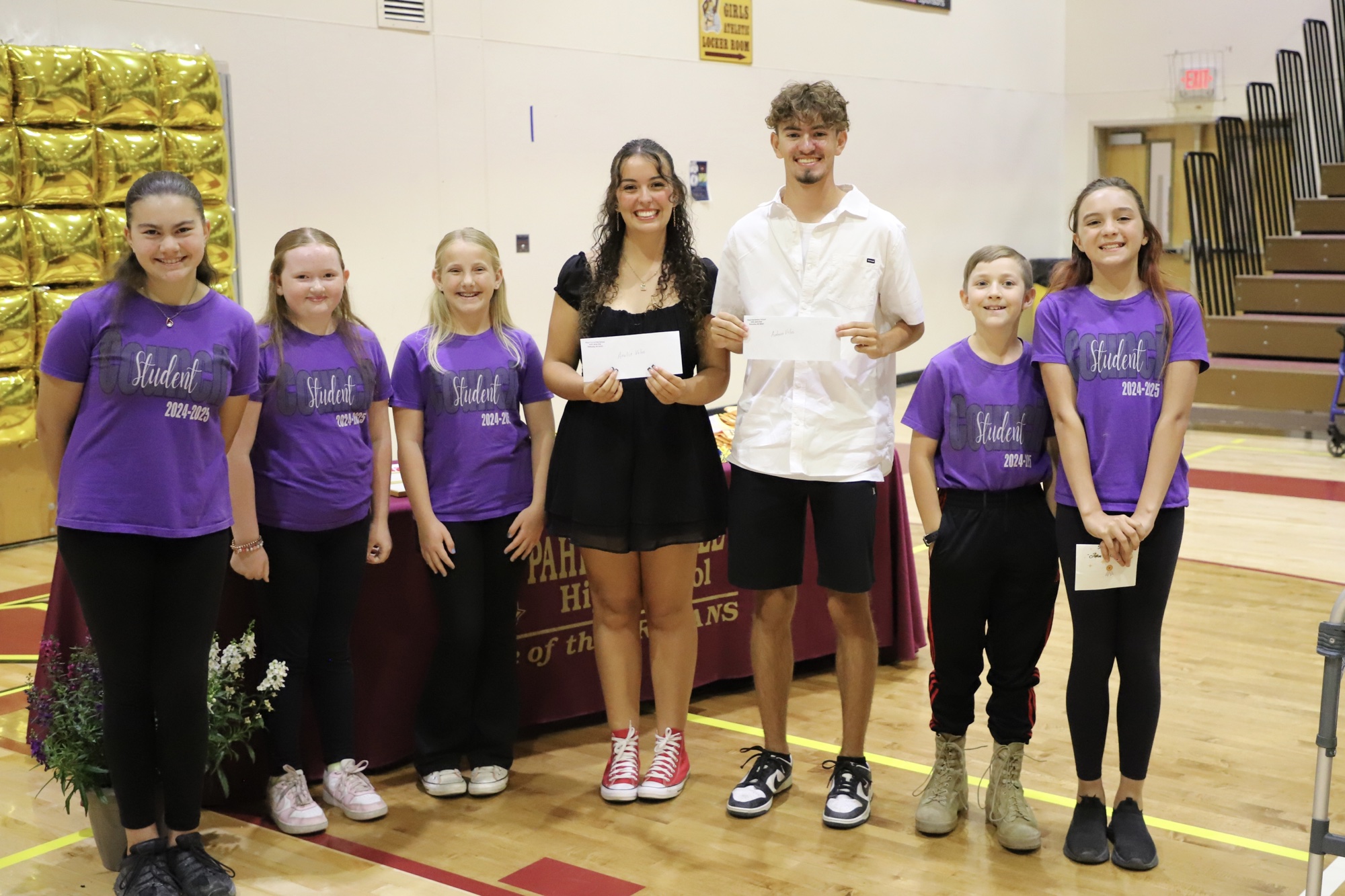 Megan and James Kinthiseng, along with Lisa Hamrick, presented the Kinthiseng Family Scholarship to Adriana Amador, Logan Shelton, and Analise Veloz. Former Floyd Elementary students Analise and Antonio Veloz were each awarded $500 scholarships presented by Mr. Hull and the Floyd Elementary Student Council, represented by President Emma Tallent, Vice President Callie Johnson, Treasurer McKenna Nye, and representatives Kimber Ostrenger and Harrison Long-Yanez.