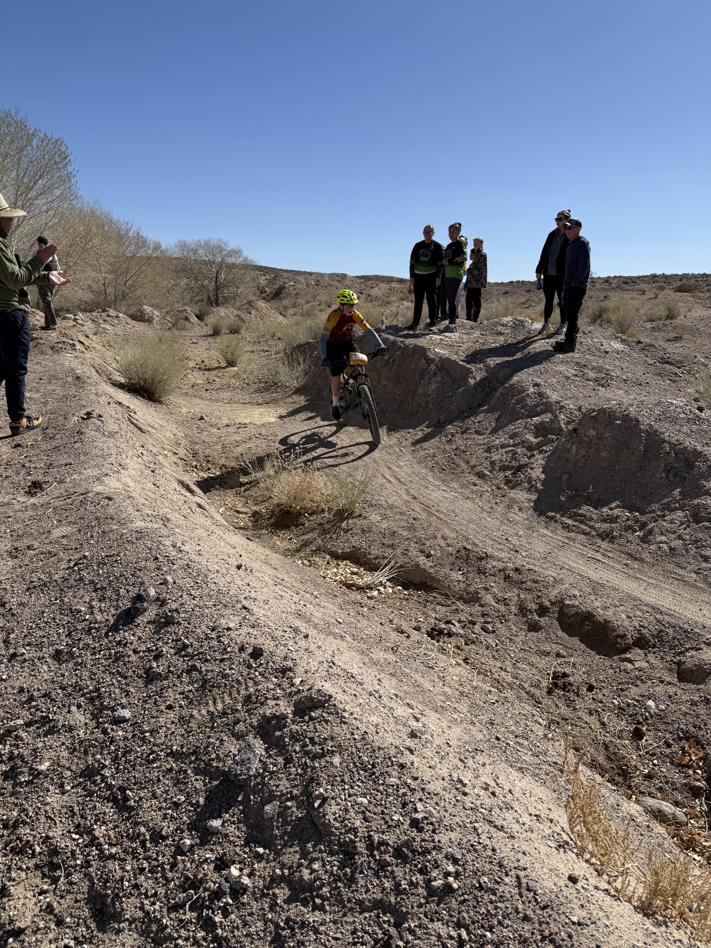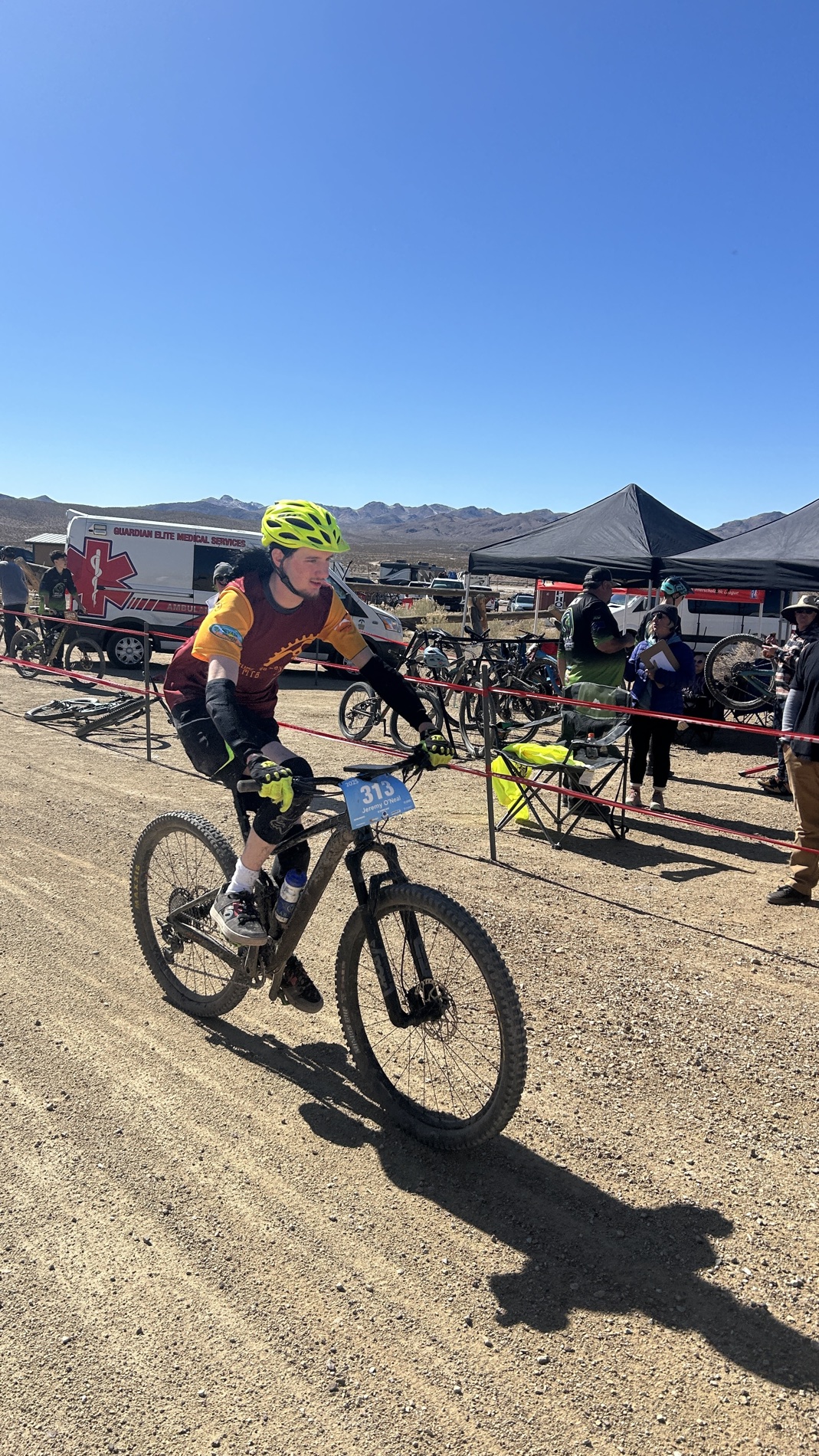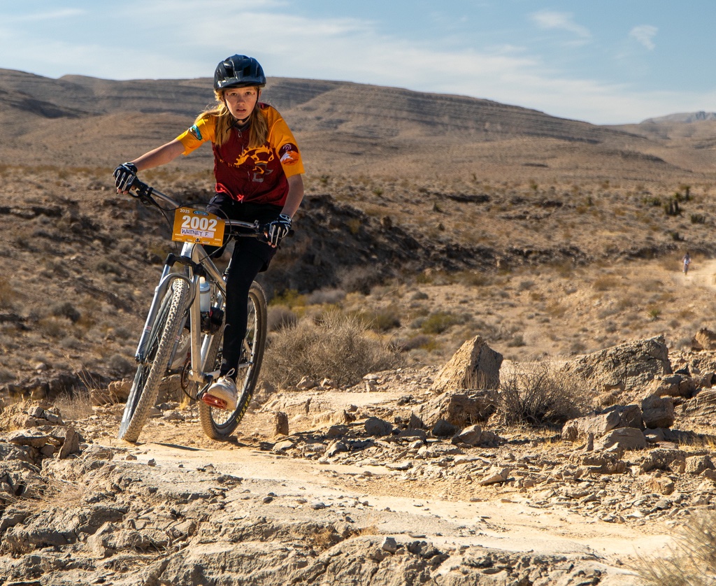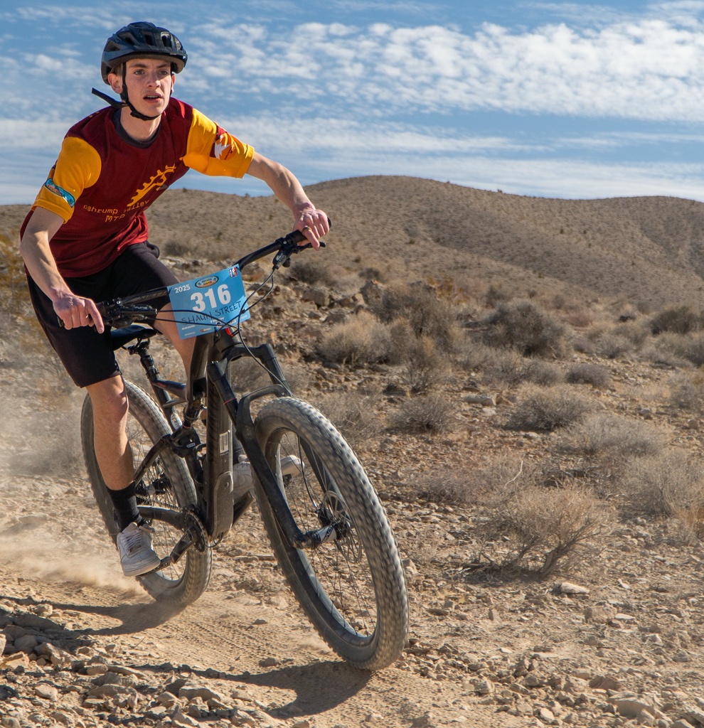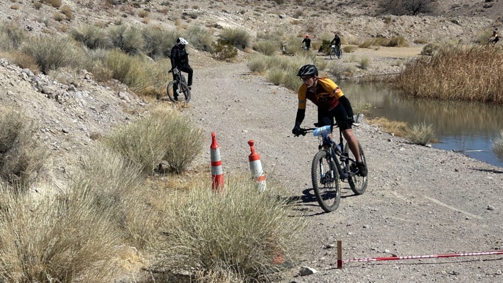 The Pahrump Valley Mountain Biking Club took to the trails at Spicer Ranch in Beatty for the Spicer Ranch Round Up on March 8, 2025. The event, themed “Rodeo,” provided an exciting challenge for riders as they navigated a course filled with rocky climbs, grass pastures, and smooth singletrack. With sections that wound around ponds, tested endurance with steep uphill climbs, and rewarded riders with fun descents, the course was as scenic as it was demanding. High school riders took on a 3.8-mile course with 450 feet of climbing per lap, while middle school athletes competed on a shorter 2.9-mile course with 250 feet of elevation gain.