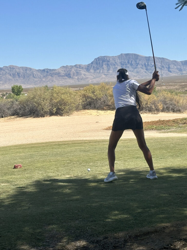 Pahrump Valley High School girls’ golf showcased their skills at a recent meet hosted by Virgin Valley, held at the Casablanca in Mesquite, NV, on August 27th. The competition was fierce, but PVHS golfer Aliana Zuniga delivered an impressive performance, shooting an 87 to secure third place overall.