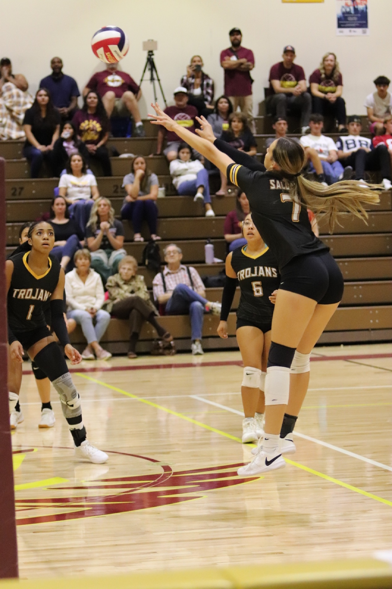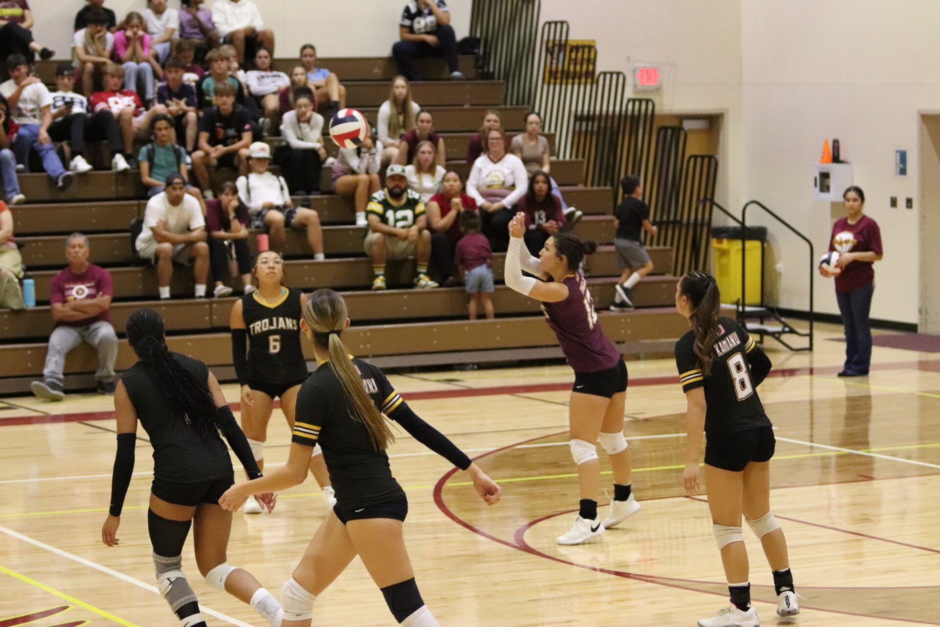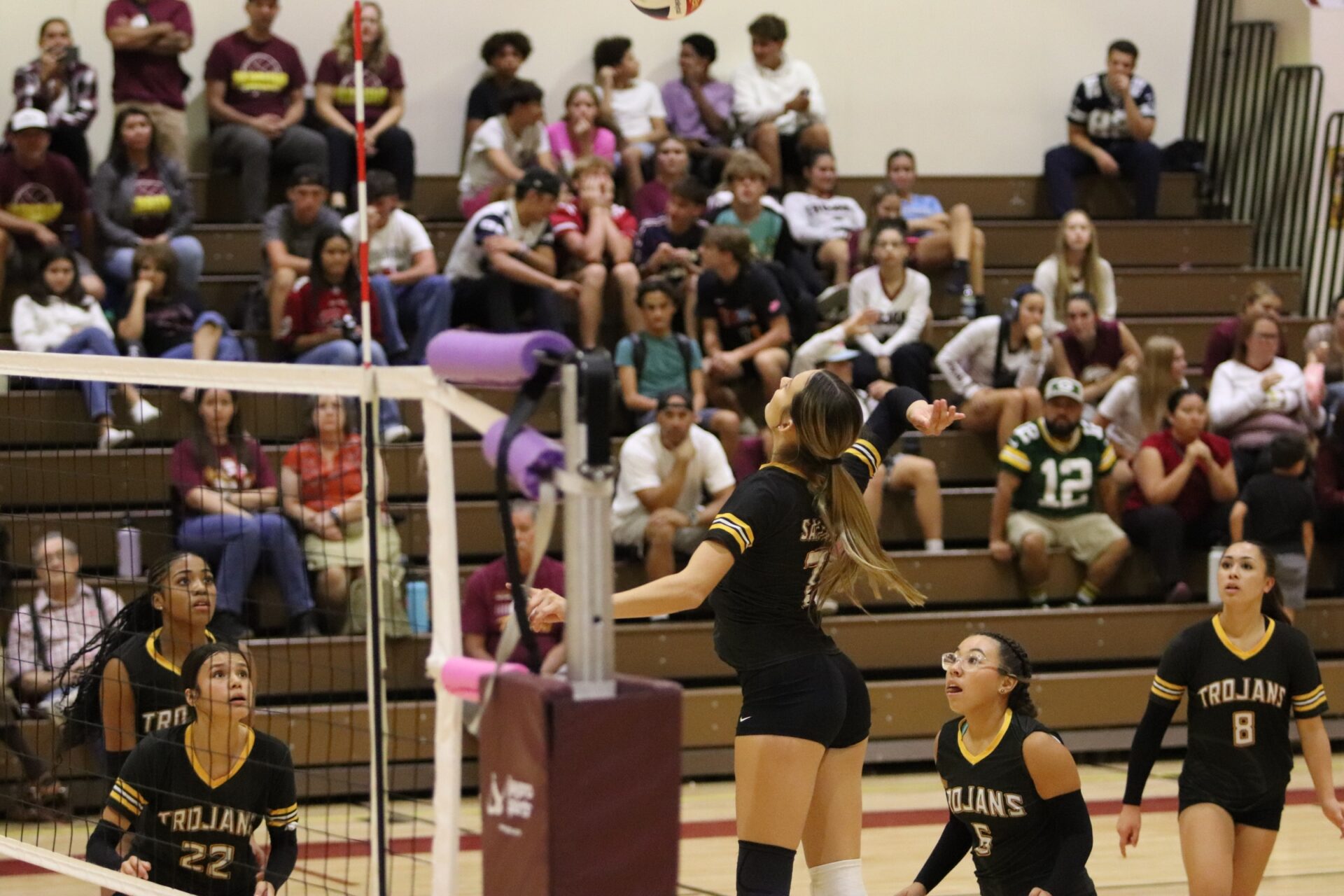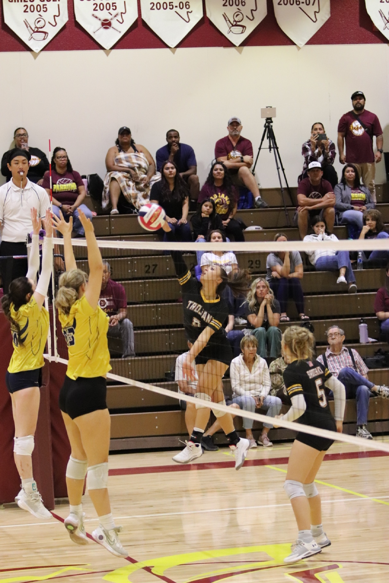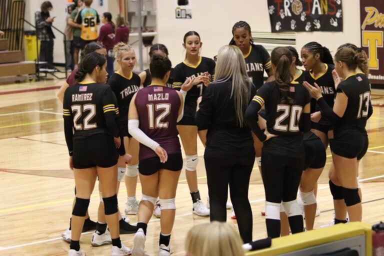 The PVHS Trojans volleyball team put up a fierce fight at home against the Boulder City Eagles on Tuesday night, ultimately falling in a hard-fought five-set match, 3-2. The game was an intense back-and-forth, with the final scores being 25-23, 25-13, 13-25, 20-25, and 15-8 in favor of the Eagles.