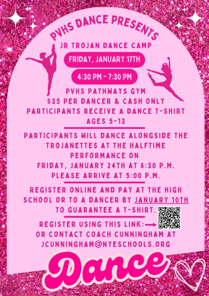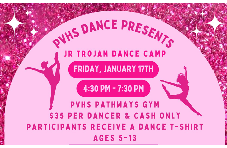 The camp will take place on Friday, January 17th, from 4:30 p.m. to 7:30 p.m. at the PVHS Pathways Gym. For $35 per dancer (cash only), participants will receive hands-on instruction, a custom dance T-shirt, and the chance to perform during the halftime show at the PVHS basketball game on Friday, January 24th. Performance participants should arrive at 5:00 p.m. on game day.