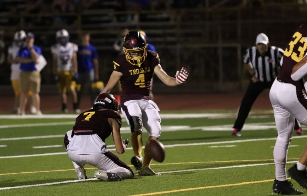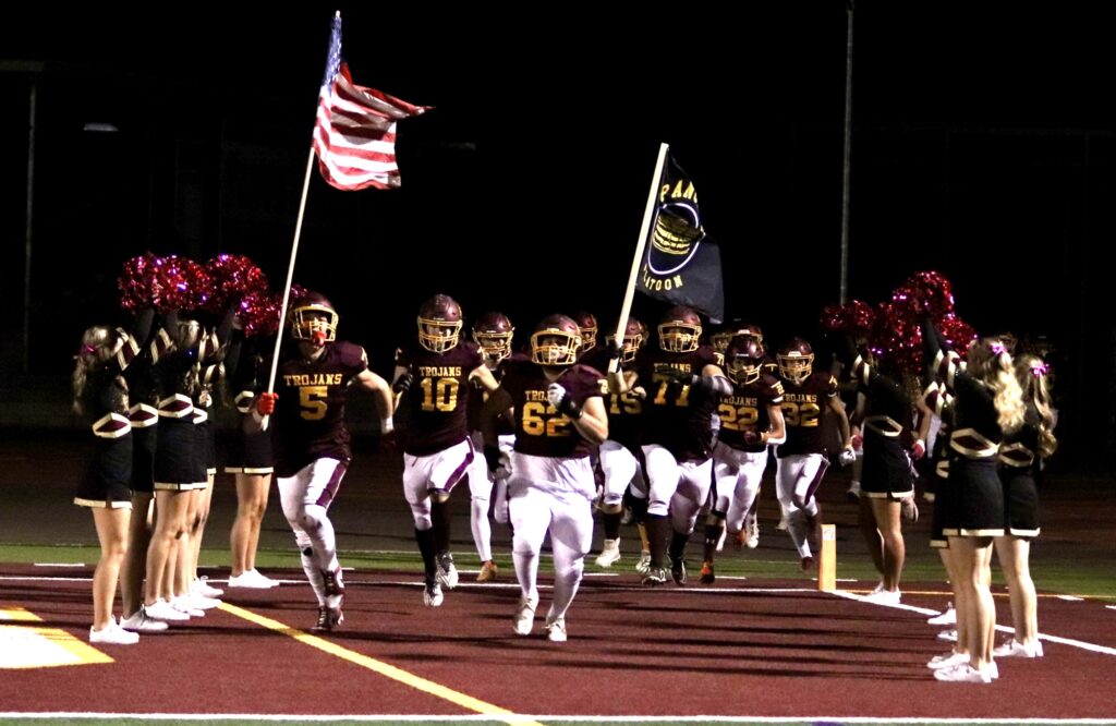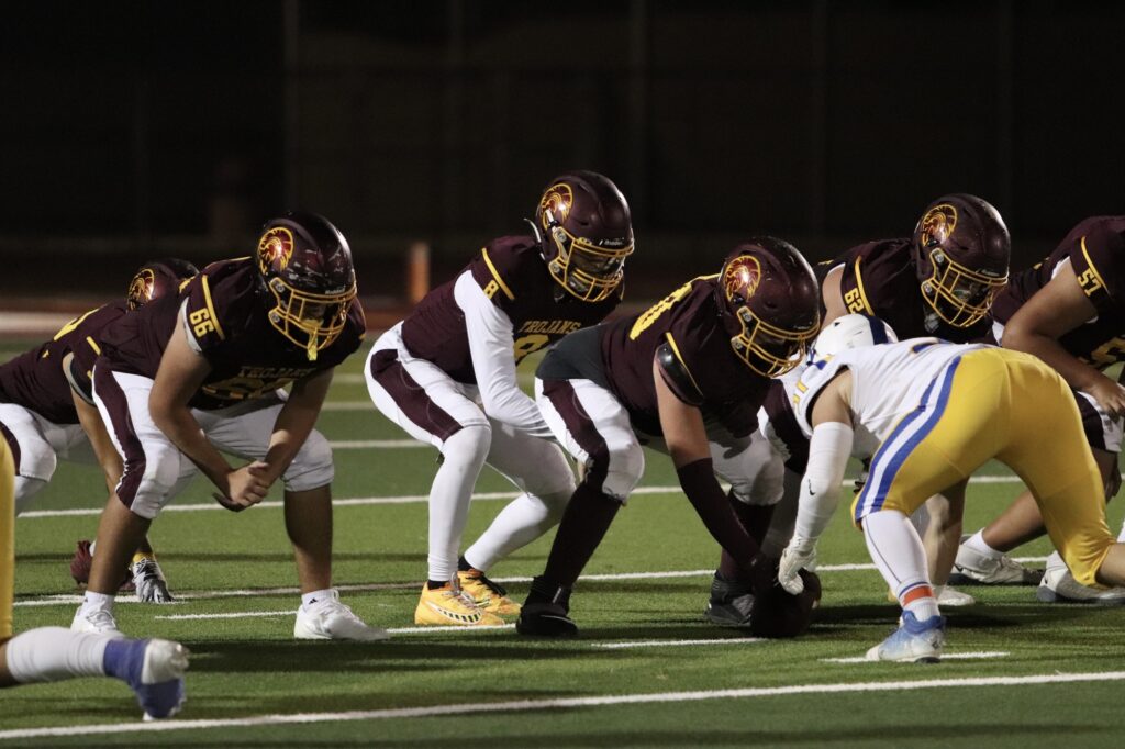 Moapa Valley struck first, scoring with 7:45 left in the first quarter to take an early 7-0 lead. However, the Trojans quickly responded when quarterback Kayne Horibe connected with Ben De Santiago and with a 35-yard run, scored the Trojans’ first touchdown of the night. Aaron Rily’s successful extra point tied the game at 7-7 with just over four minutes left in the quarter.