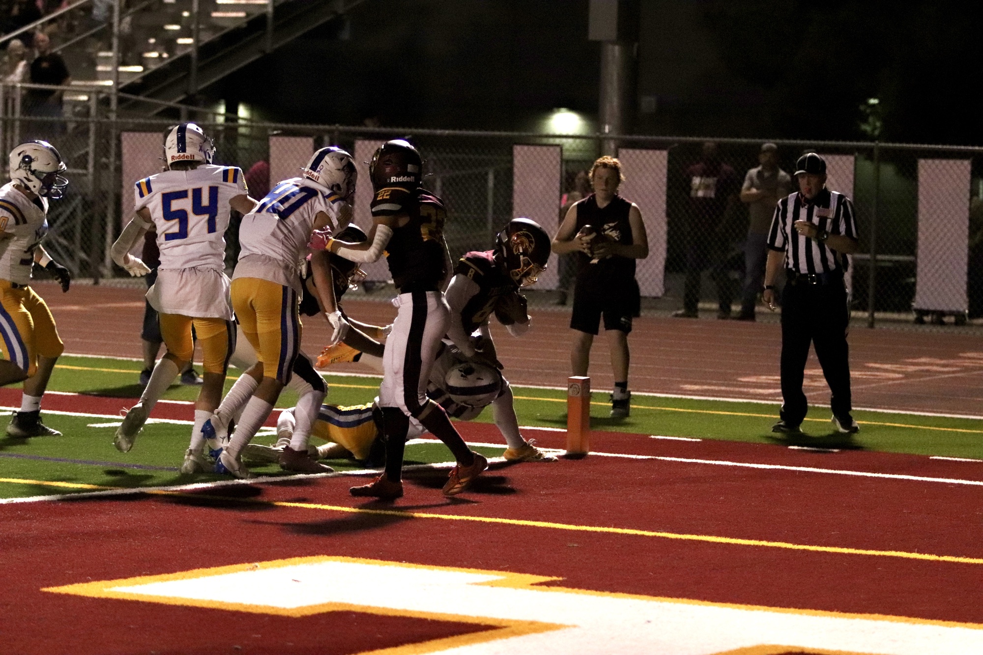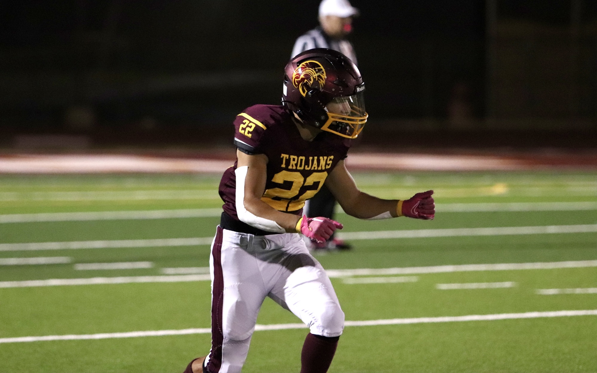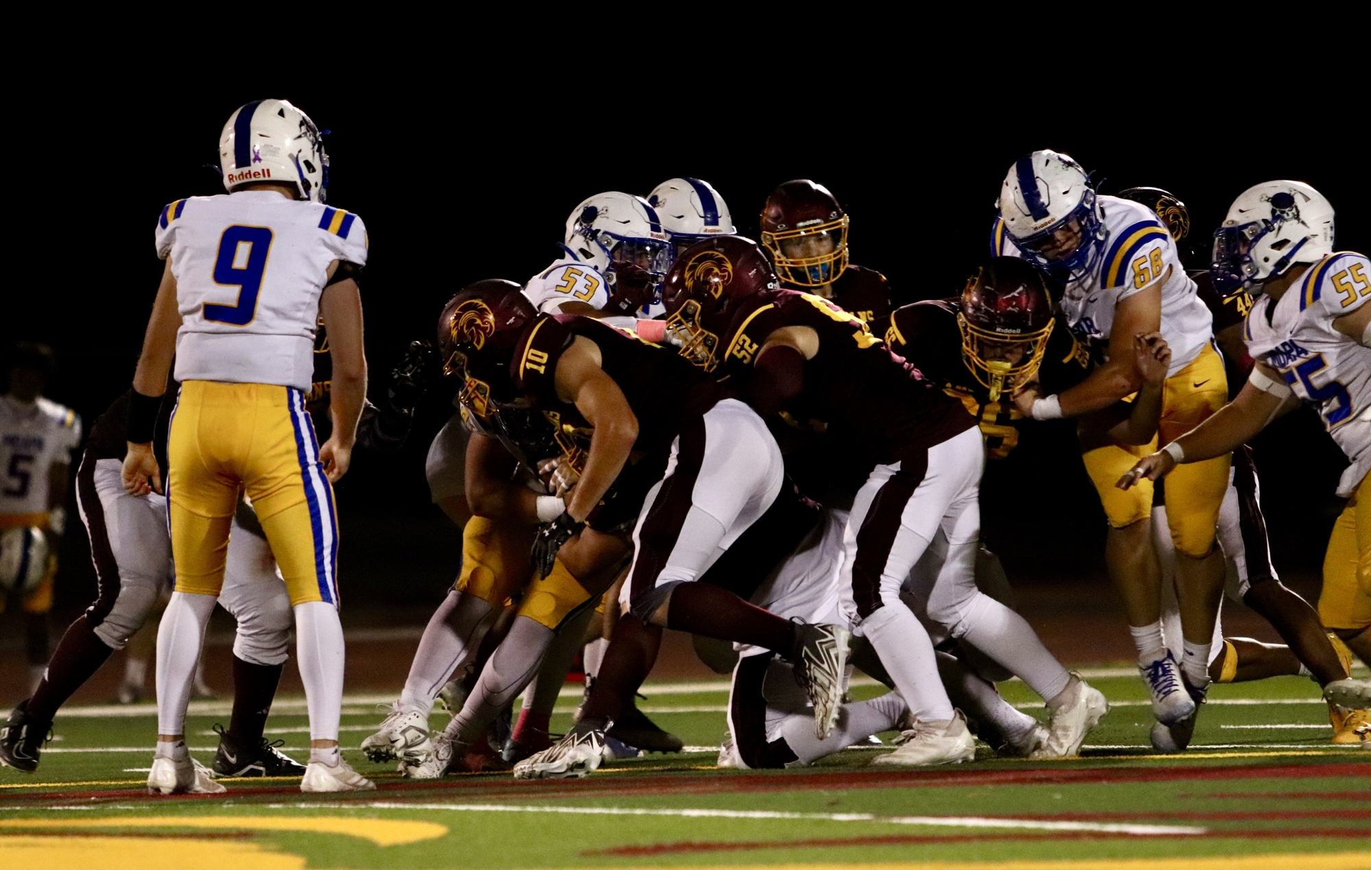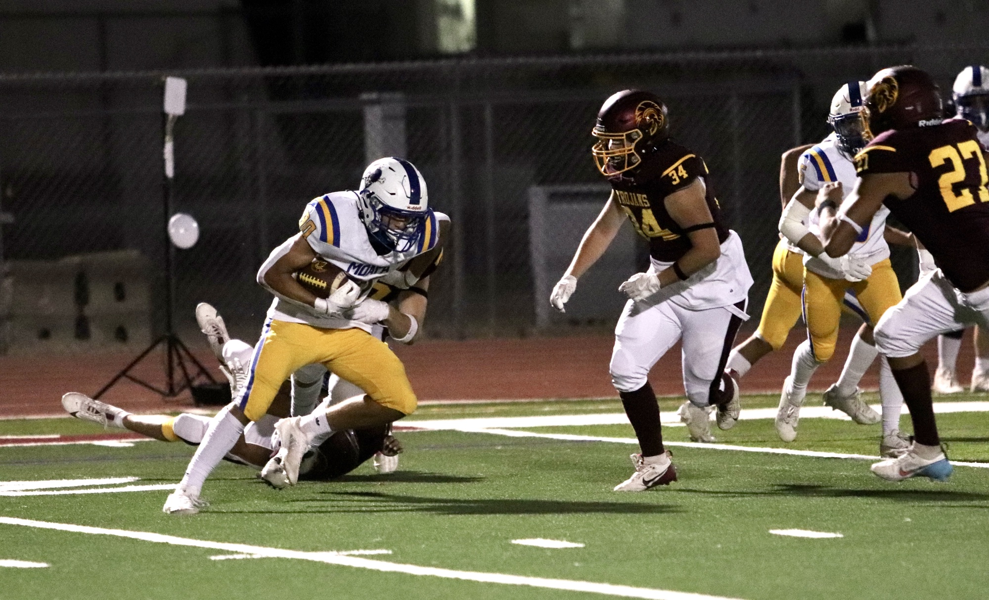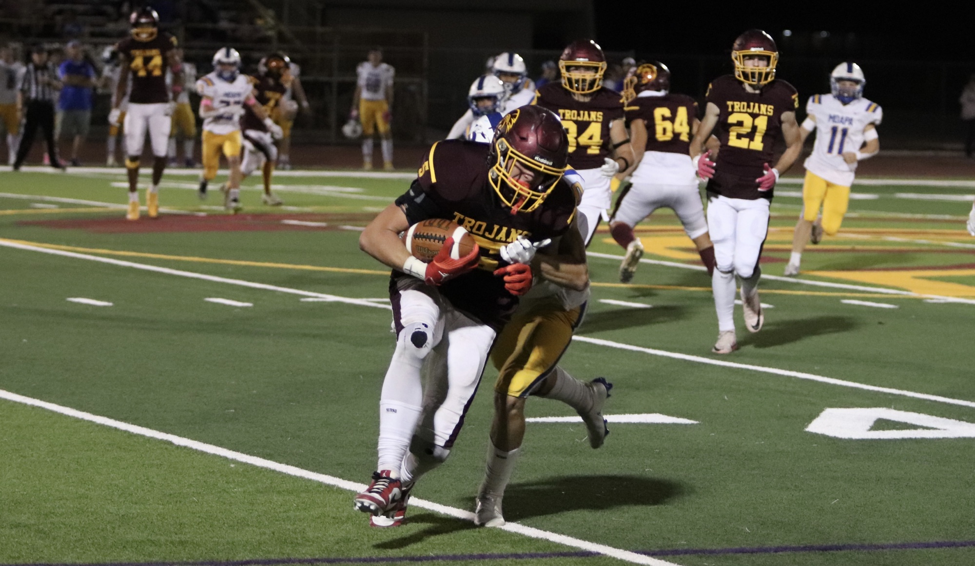 Moapa Valley struck first, scoring with 7:45 left in the first quarter to take an early 7-0 lead. However, the Trojans quickly responded when quarterback Kayne Horibe connected with Ben De Santiago and with a 35-yard run, scored the Trojans’ first touchdown of the night. Aaron Rily’s successful extra point tied the game at 7-7 with just over four minutes left in the quarter.