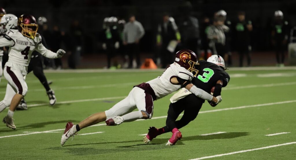 The Bulls continued to press forward, adding two more touchdowns before halftime and expanding their lead to 28-7. In the third quarter, SLAM’s running game proved challenging to stop, with another touchdown widening the gap to 35-7. Yet the Trojans refused to back down; Horibe connected with Austin Alvarez for a touchdown, though the extra point attempt was blocked, bringing the score to 35-13.