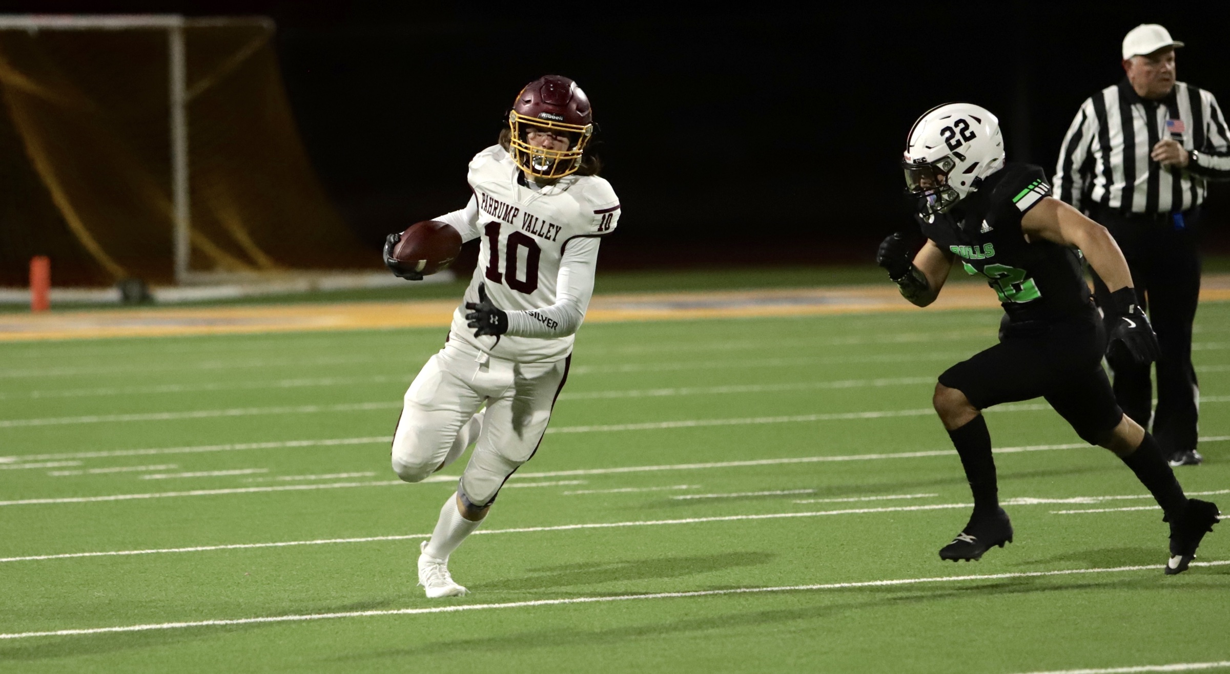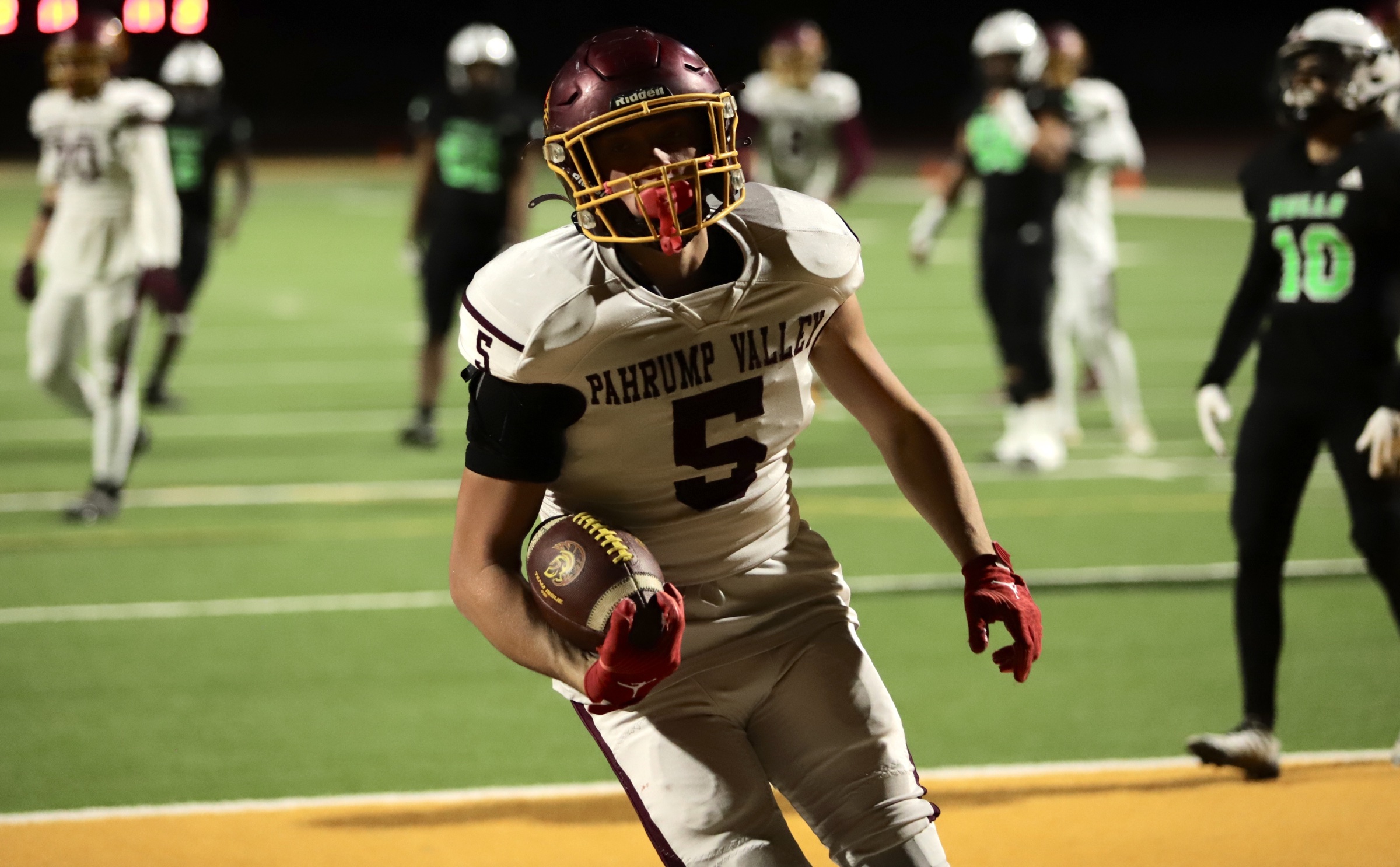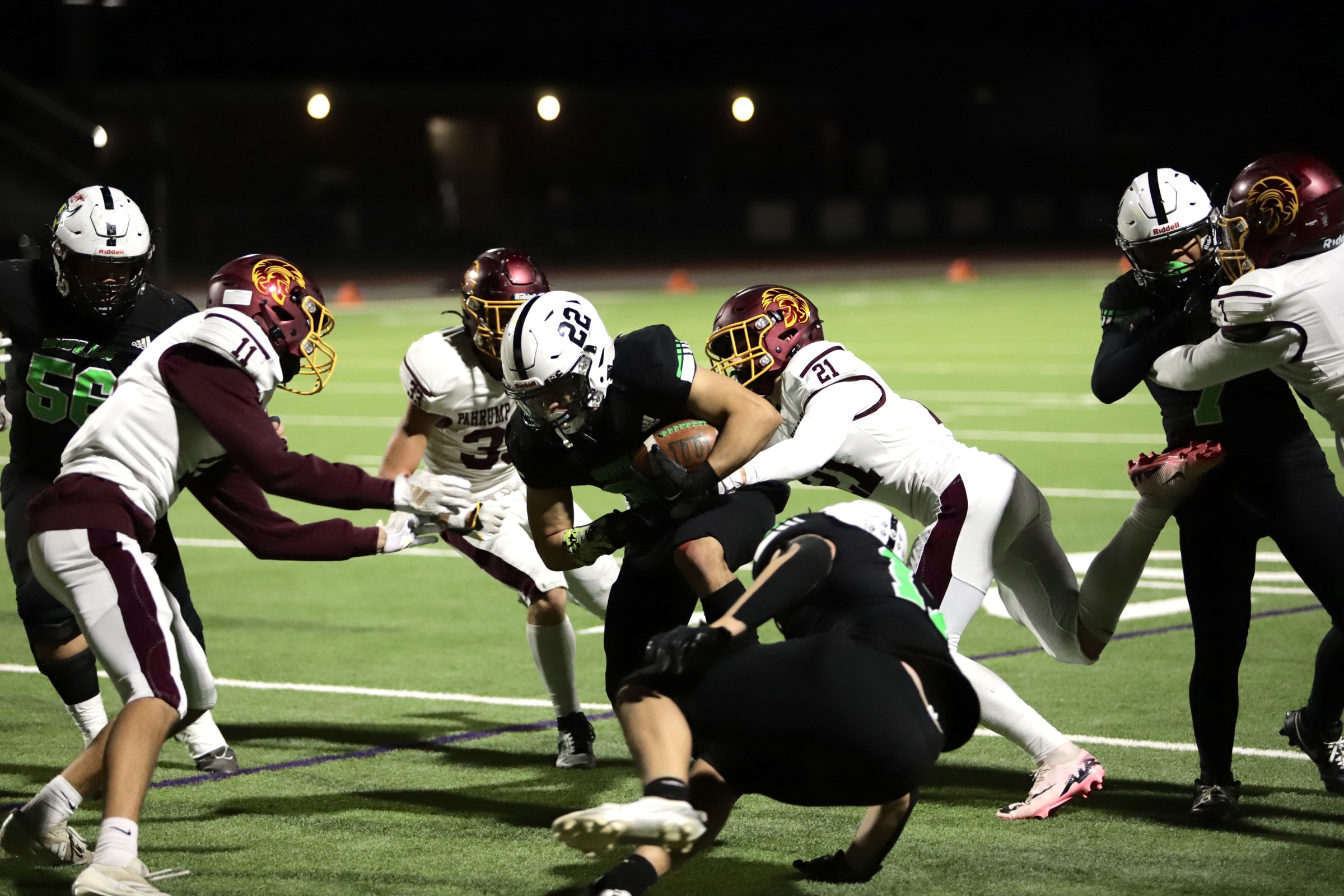 The game opened with SLAM taking a strong lead, with two touchdowns, putting the Bulls up 14-0 by the end of the first quarter. The Trojans answered back early in the second quarter, capitalizing on field position granted by an unnecessary roughness penalty against the Bulls. Pahrump’s offensive drive culminated in a pass from quarterback Kayne Horibe to Ethen Hutchison in the end zone, with Aaron Rily’s extra point narrowing the score to 14-7.