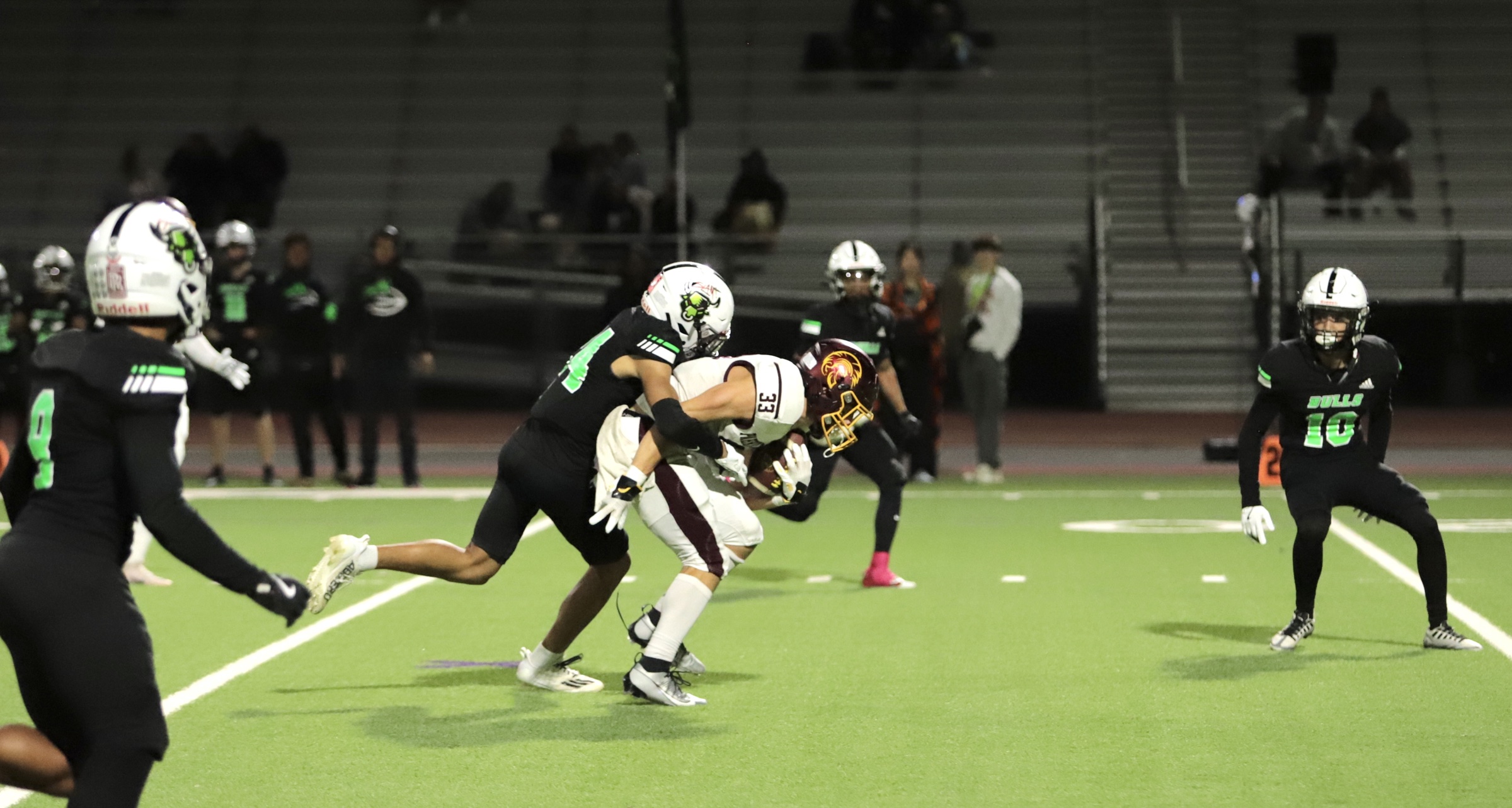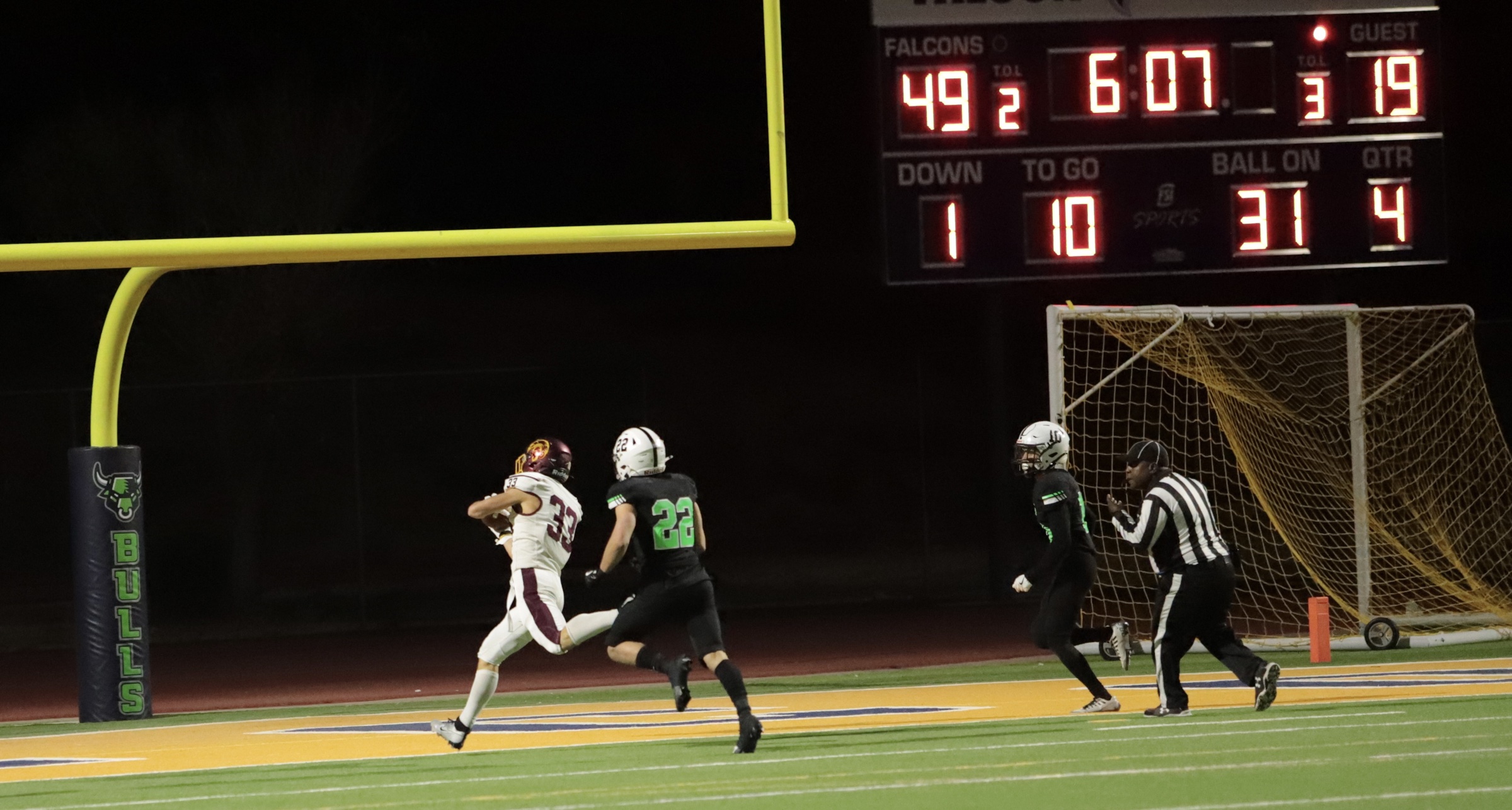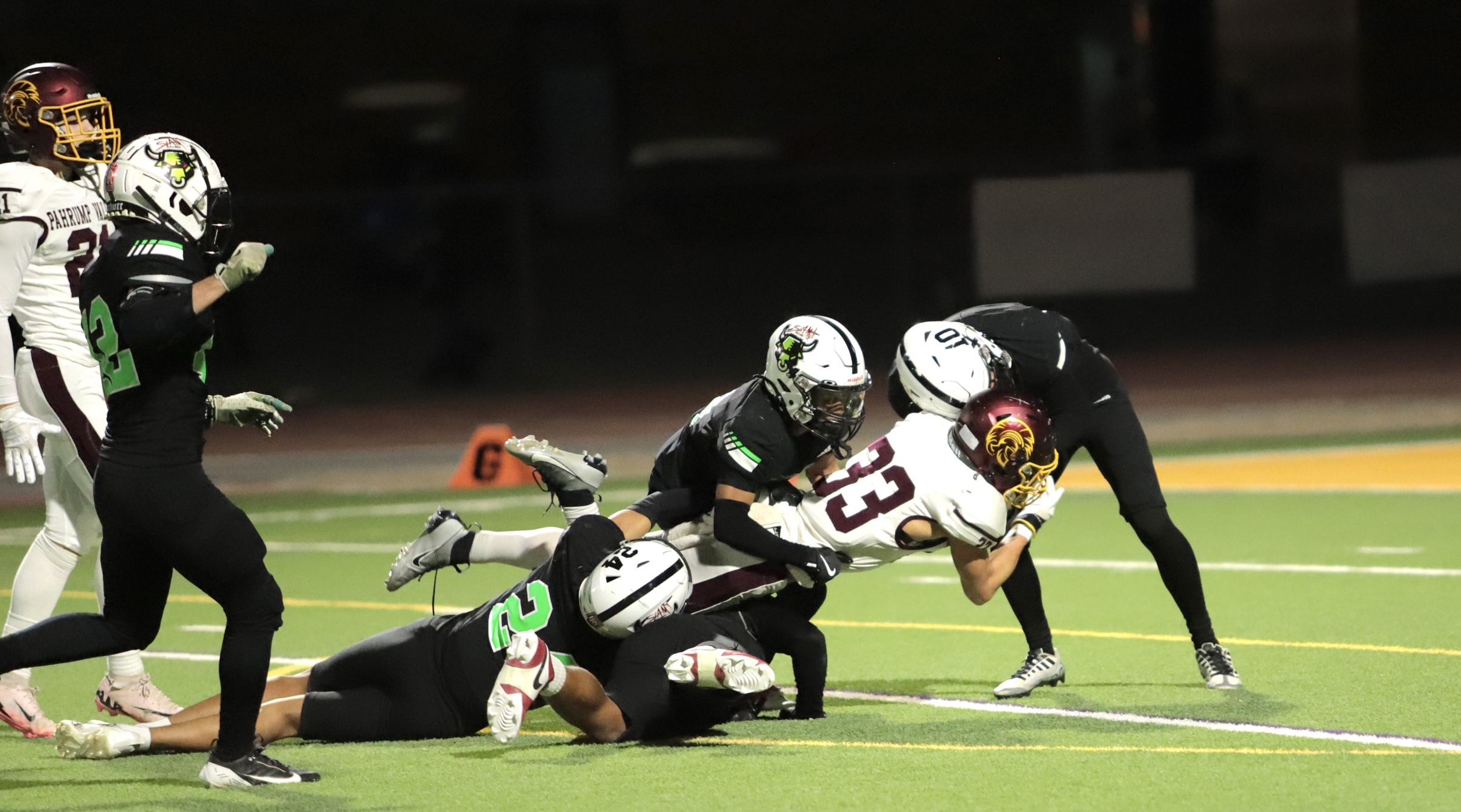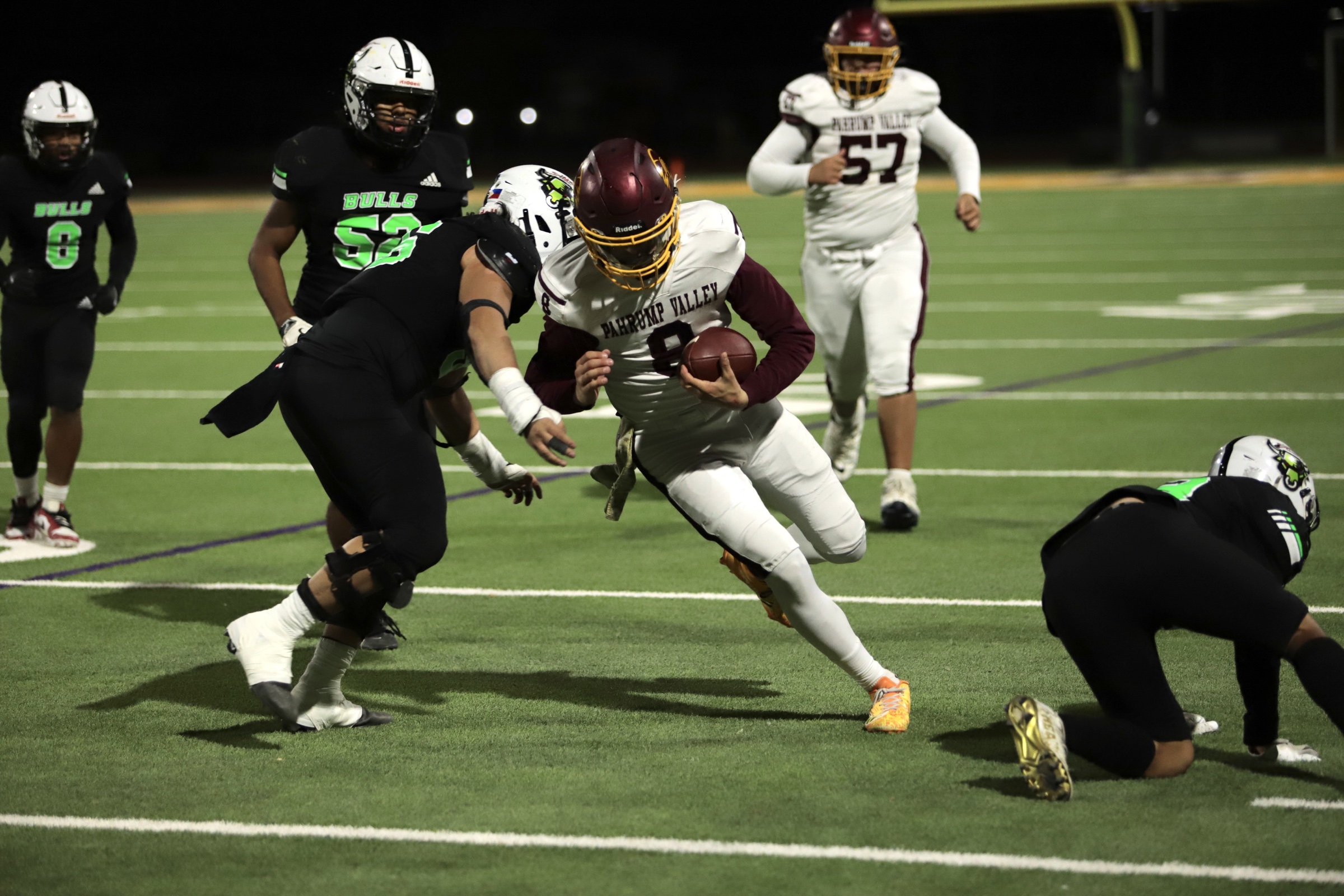 The game opened with SLAM taking a strong lead, with two touchdowns, putting the Bulls up 14-0 by the end of the first quarter. The Trojans answered back early in the second quarter, capitalizing on field position granted by an unnecessary roughness penalty against the Bulls. Pahrump’s offensive drive culminated in a pass from quarterback Kayne Horibe to Ethen Hutchison in the end zone, with Aaron Rily’s extra point narrowing the score to 14-7.