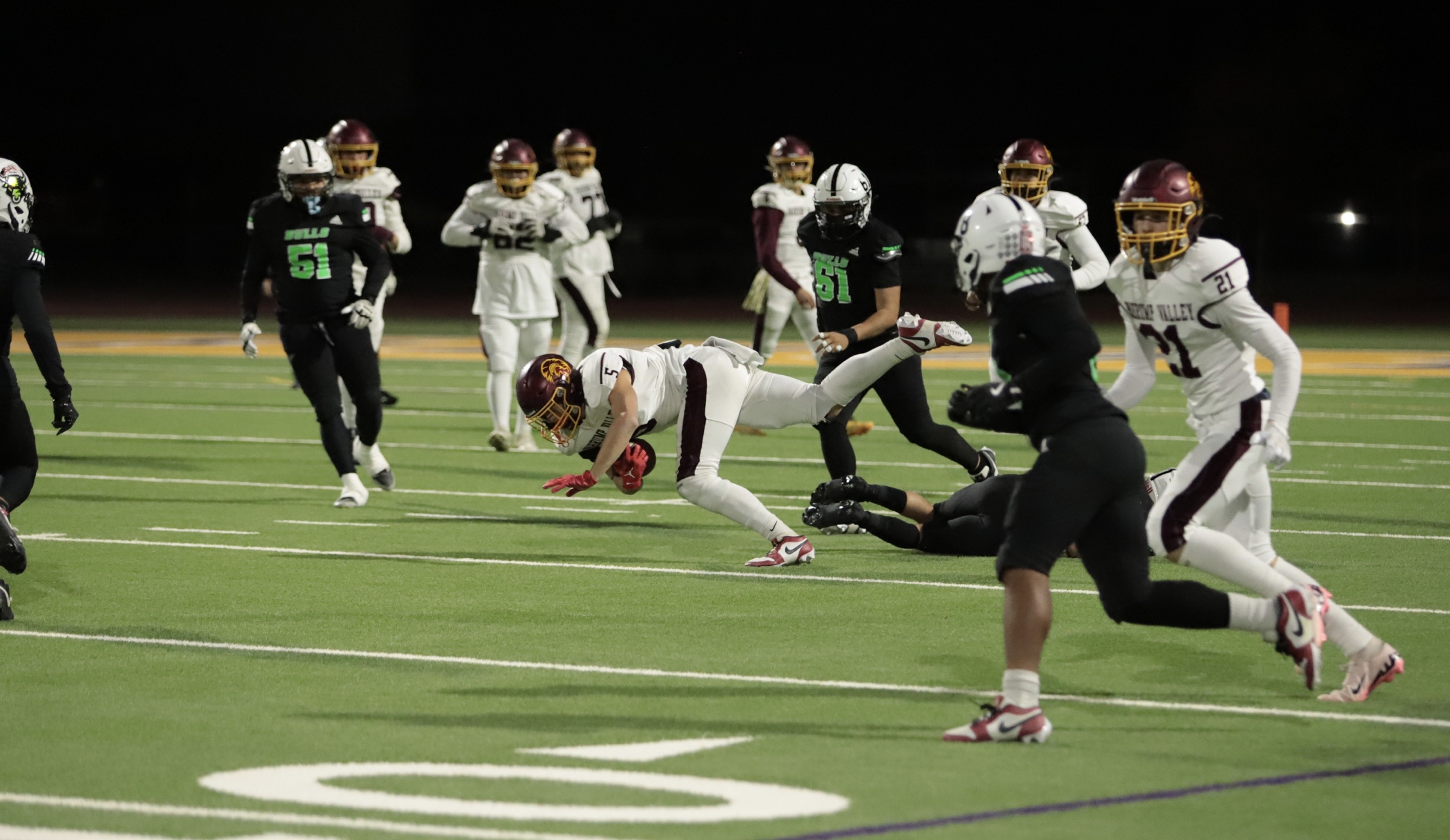 The Bulls continued to press forward, adding two more touchdowns before halftime and expanding their lead to 28-7. In the third quarter, SLAM’s running game proved challenging to stop, with another touchdown widening the gap to 35-7. Yet the Trojans refused to back down; Horibe connected with Austin Alvarez for a touchdown, though the extra point attempt was blocked, bringing the score to 35-13.