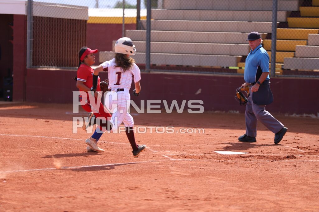 In the bottom of the first, the Trojans’ offense exploded. Ryleigh Denton led off with a base hit up the middle and stole second almost immediately. Kayleen Carranza followed with a pop-up that fell safely in front of second base, and with Danika Cox-Hosino hit by a pitch, the bases were loaded. Ava Chiancone was also hit, forcing in the game’s first run. Carranza then stole home on a passed ball, followed by Cox-Hosino scoring on a sacrifice fly from Kayla Glenn. Autumn Colon drew a walk to keep the pressure on, and Evalenne Armendariz reached safely after a miscommunication between the Valley catcher and third baseman. Madison Rodriguez grounded to short, bringing home another run, and after a lineout, Denton walked to reload the bases. Carranza came through again with a hit to right field, scoring Armendariz and Rodriguez to cap a seven-run inning for Pahrump Valley.