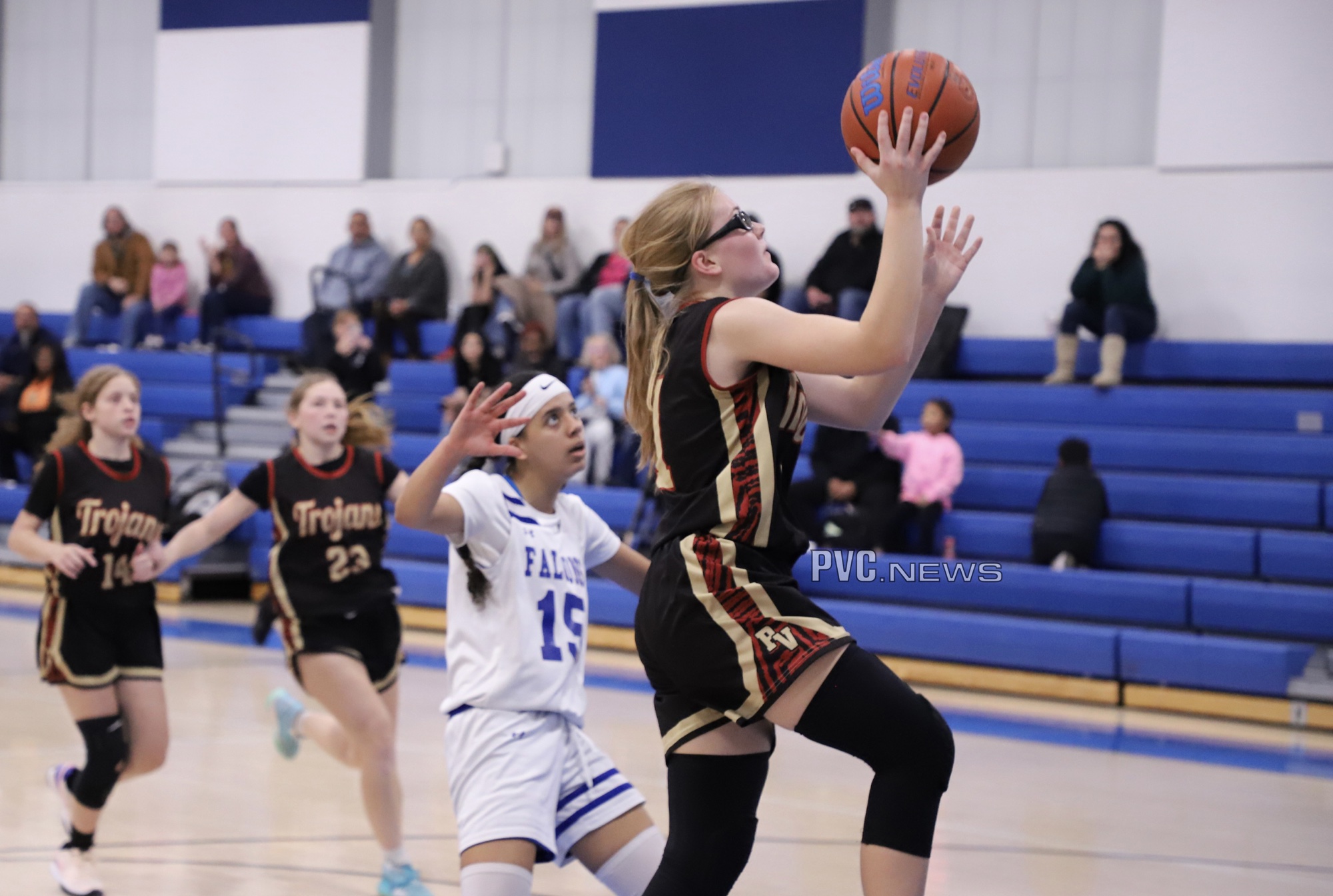 The game opened with the Falcons scoring the first six points, putting the Trojans in an early deficit. Ryleigh Denton got the Trojans on the board with a free throw, followed by Riley Saldana capitalizing on a rebound to make it 6-3. Saldana’s jumper and a backdoor cut from Jules Ondrisko helped the Trojans close the gap. By the end of the first quarter, the Trojans trailed by just one point, 10-9.